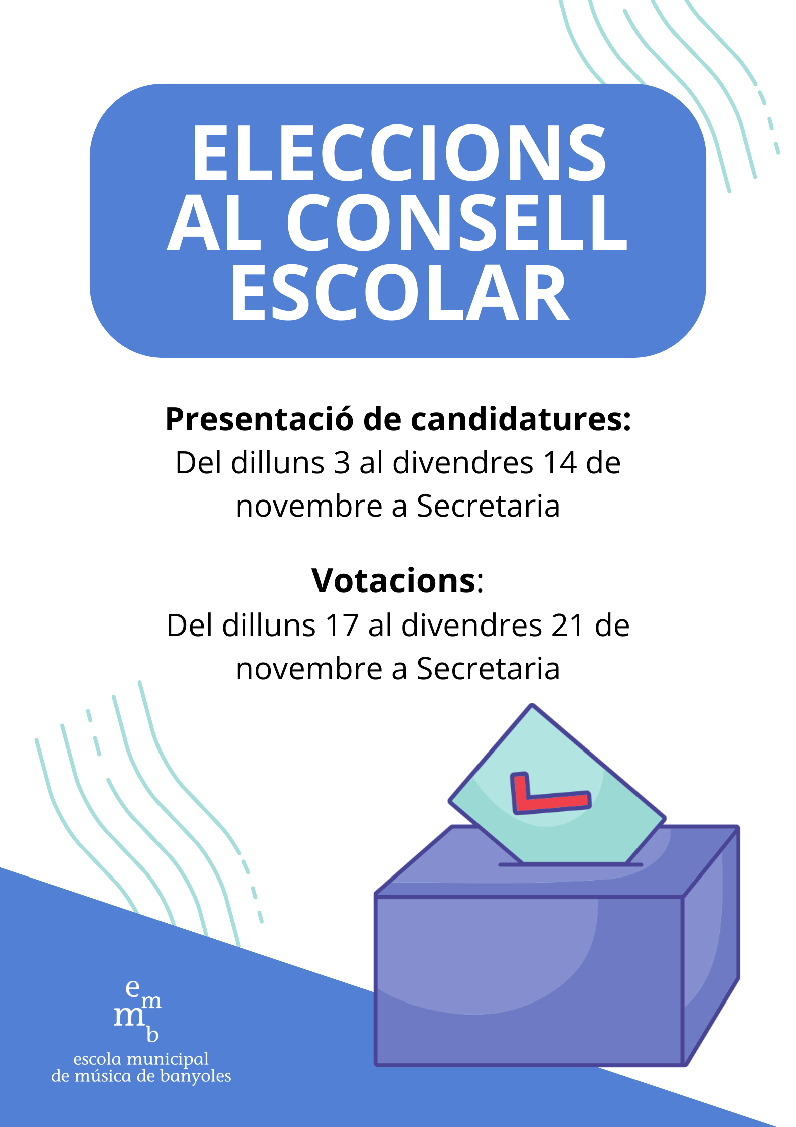Us animem a formar part d'aquest Consell Escolar! Només heu d'adreçar-vos a la Secretaria de l'EMMB fins al 14 de novembre.